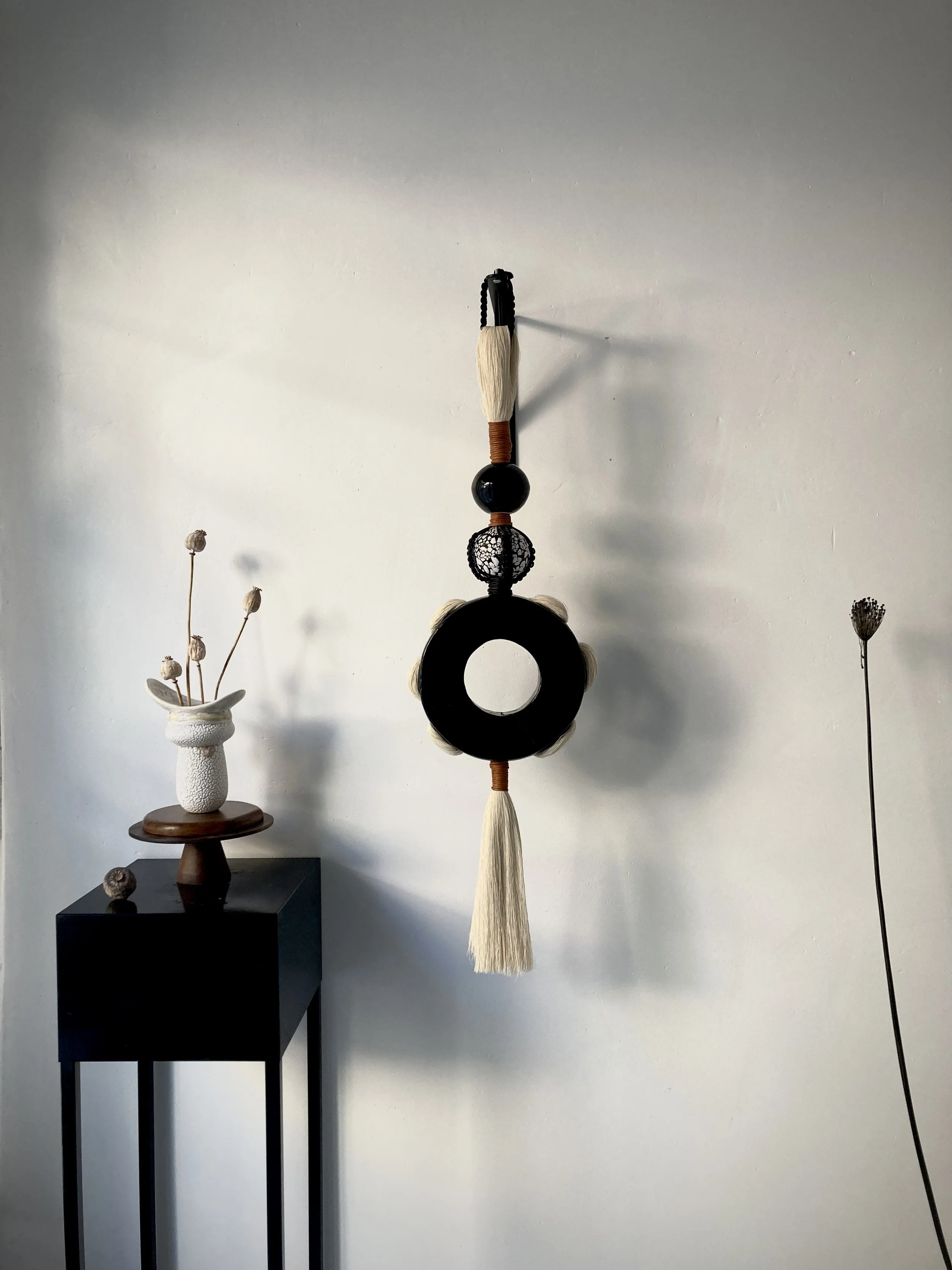 Dans ces œuvres, tout est suspension : suspension des matières, suspension du temps, suspension entre deux cultures. Le cuir, le grès, le coton — chacun garde sa voix, mais ensemble, ils chantent une même mélodie, celle d’un équilibre précaire, d’une beauté née de la tension entre poids et légèreté, ombre et lumière.
